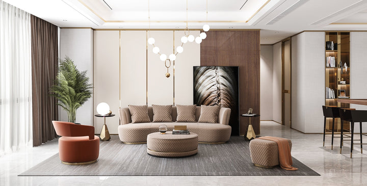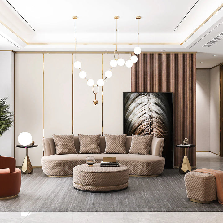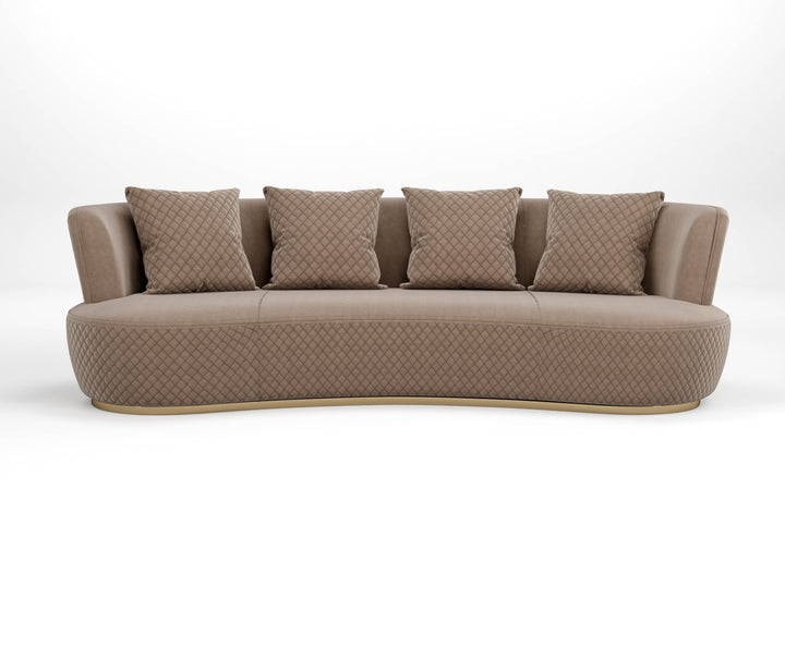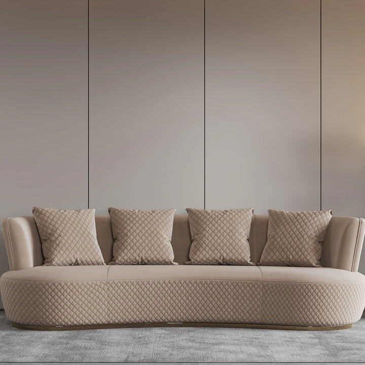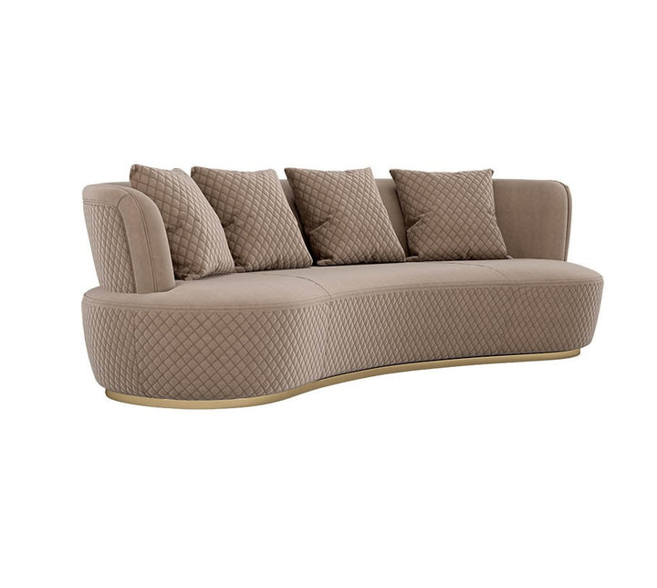 Introduce refined comfort and design into your living space with the Millington Sofa. This elegantly curved piece is upholstered in rich quilted suede fabric, offering both a luxurious texture and a warm, inviting feel. Built on a durable hardwood frame, it ensures stability and longevity while delivering plush comfort with its high-resilience sponge filling. The minimalist silhouette and subtle golden base make this sofa a seamless fit for both modern and transitional interiors. Perfect for upscale living areas seeking both sophistication and relaxation.
