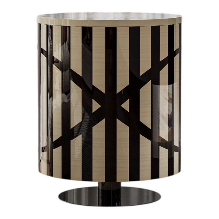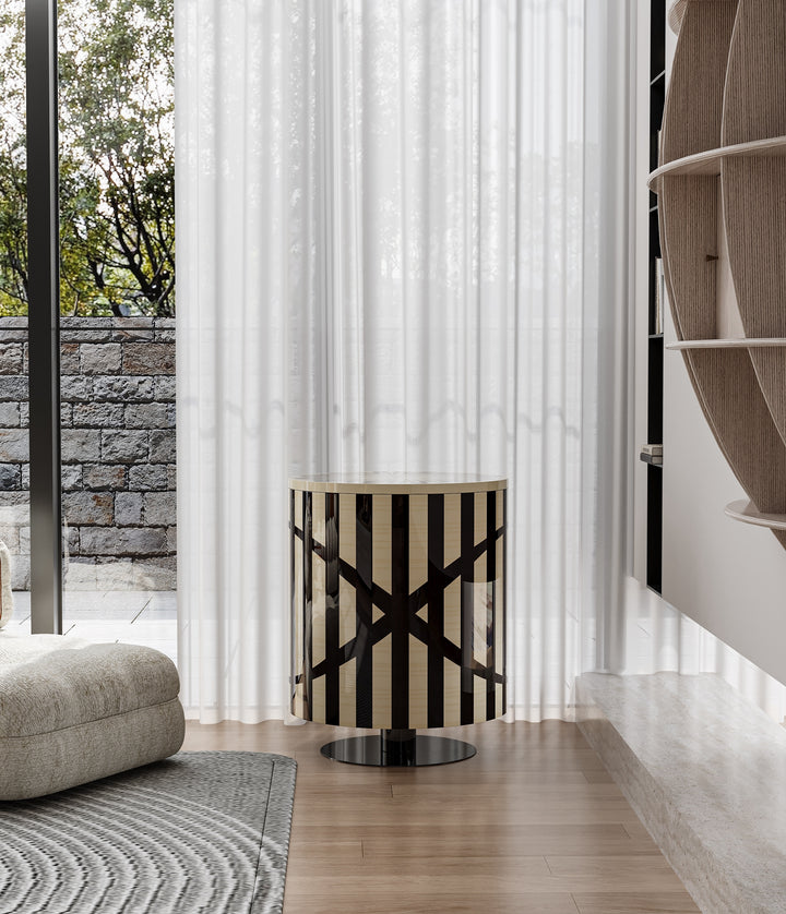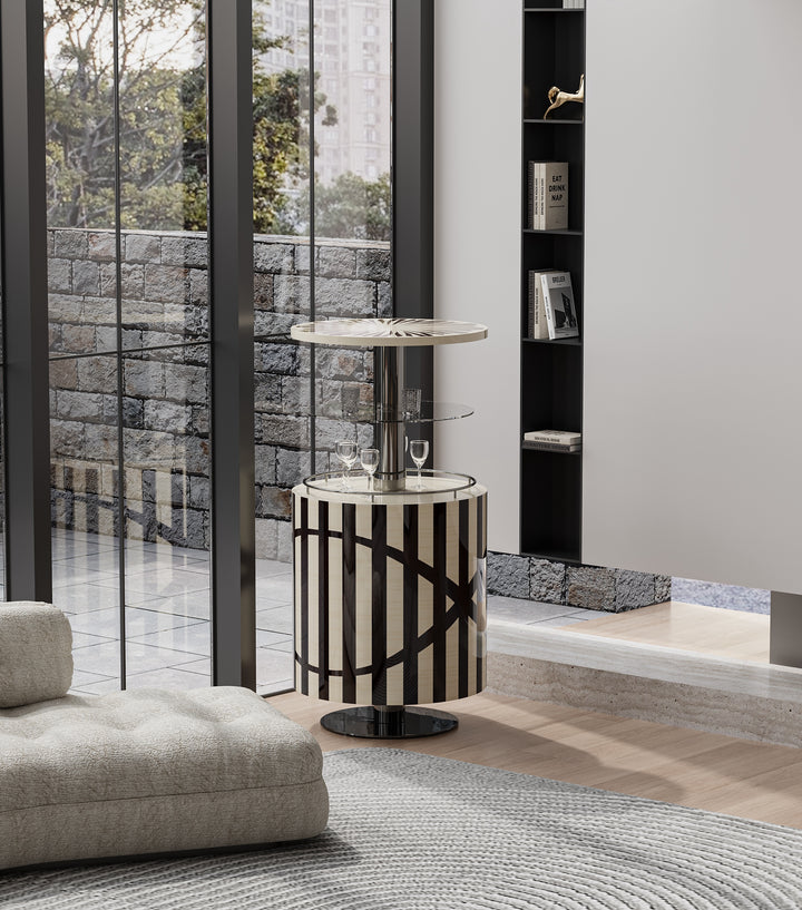 The Morgan Motorized Wine Cabinet Side Table blends high end craftsmanship with smart functionality. Featuring a high gloss cream and black strip wood exterior, this statement piece doubles as a stylish storage solution. Its motorized lift design reveals hidden compartments, perfect for storing wine glasses, spirits, or barware.