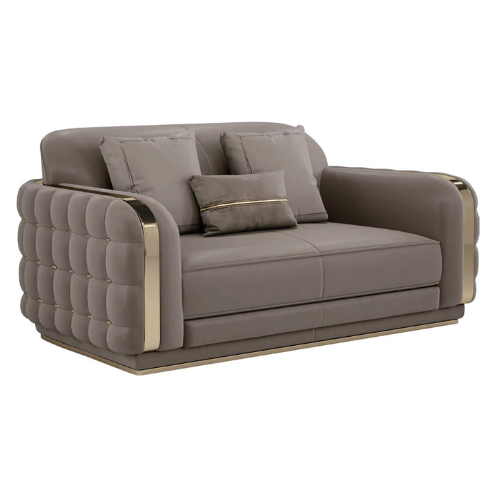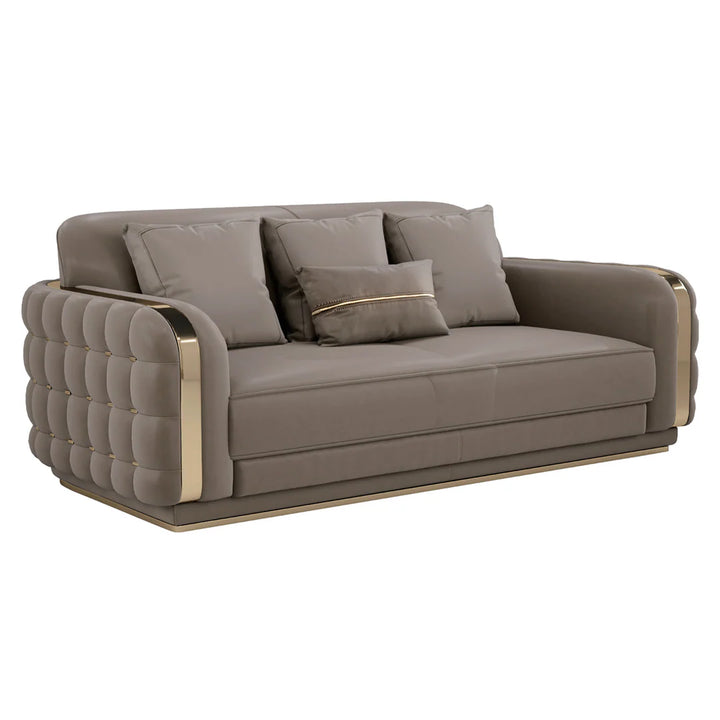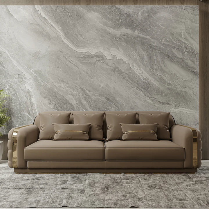 Introducing the Rockhall Sofa Set where craftsmanship meets luxury. Designed to elevate your living room, this sophisticated piece features a sleek upper backrest in golden ebony engineered wood veneer that adds a refined aesthetic. The Rockhall is upholstered in premium genuine leather and filled with high-density sponge for unbeatable comfort and support. A true balance of natural wood textures and modern leather luxury, ideal for upscale contemporary interiors.